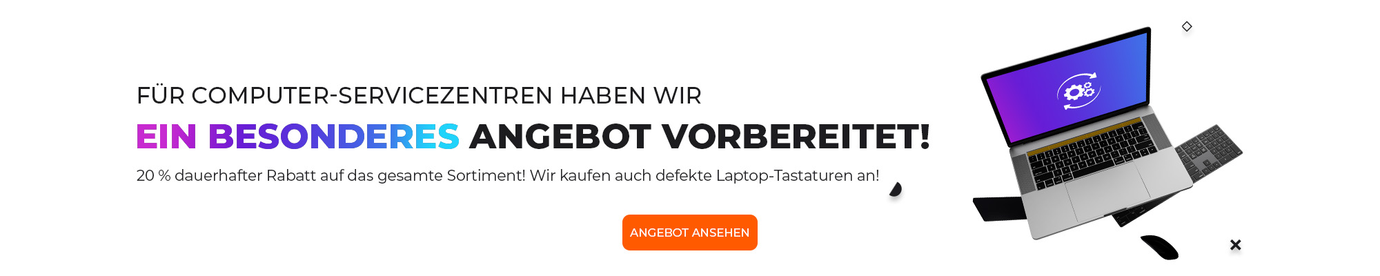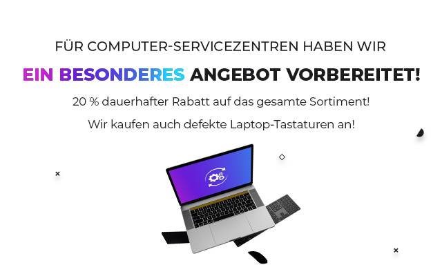 Eine gebrochene oder fehlende Taste am Laptop ist häufig die Ursache von mechanischen Schäden, grobem Reinigen der Tastatur, Fabrikationsfehlern, aber auch das Resultat von spielenden Kindern oder Tieren. Ein komplettes Set zum Reparieren des Verlustes an der Tastatur besteht aus einer Taste, der Befestigung und einem Gummi. Damit die Taste passt muss geprüft werden, ob der Scharnier identisch zu den auf den Bildern in unserem Shop ist. Produzenten verwenden in den selben Gerätemodellen verschiedene Befestigungen für die Tasten – deshalb ist die richtige Auswahl sehr wichtig. Zu jedem gekauften Ersatzset bieten wir den Kauf einer Ersatz-Halterung zum Sonderpreis an. Falls Sie nicht das komplette Set benötigen, bieten wir Ihnen auch einzelne Tasten für Tastaturen sowie einzelne Tastatur-Halterungen zum Verkauf an.