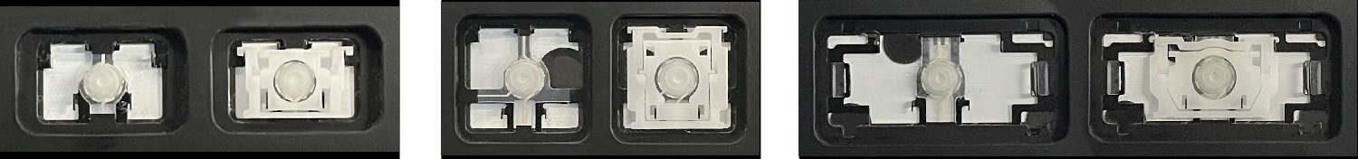 - Bei den meisten Tastaturen, die von außen identisch aussehen, wurden unterschiedliche Arten von Scharnieren unter den Tasten verwendet.