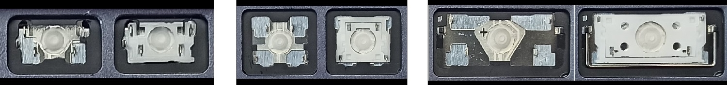 - Bei den meisten Tastaturen, die von außen identisch aussehen, wurden unterschiedliche Arten von Scharnieren unter den Tasten verwendet.