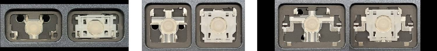 - Bei den meisten Tastaturen, die von außen identisch aussehen, wurden unterschiedliche Arten von Scharnieren unter den Tasten verwendet.