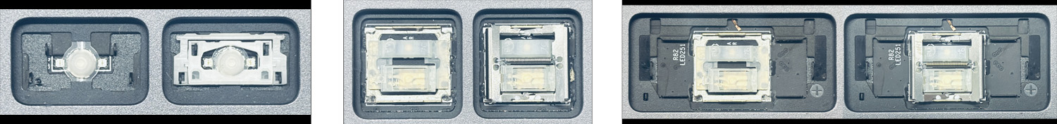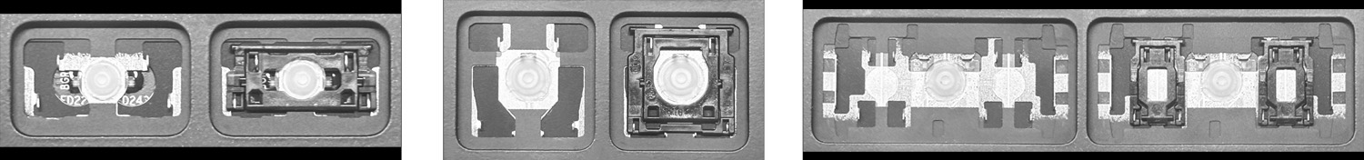 - Bei den meisten Tastaturen, die von außen identisch aussehen, wurden unterschiedliche Arten von Scharnieren unter den Tasten verwendet.