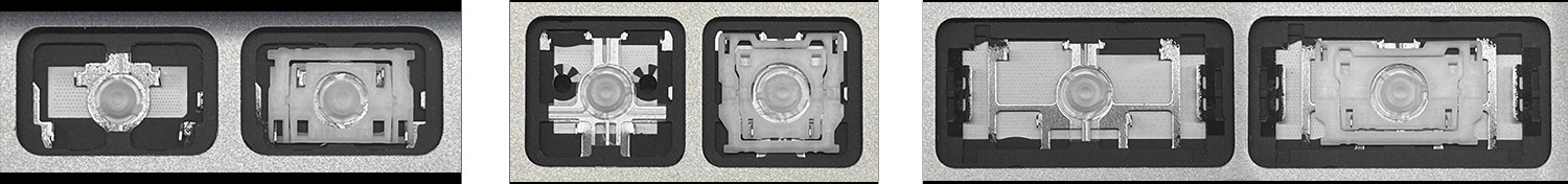 - Bei den meisten Tastaturen, die von außen identisch aussehen, wurden unterschiedliche Arten von Scharnieren unter den Tasten verwendet.
