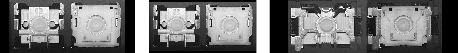 - Bei den meisten Tastaturen, die von außen identisch aussehen, wurden unterschiedliche Arten von Scharnieren unter den Tasten verwendet.