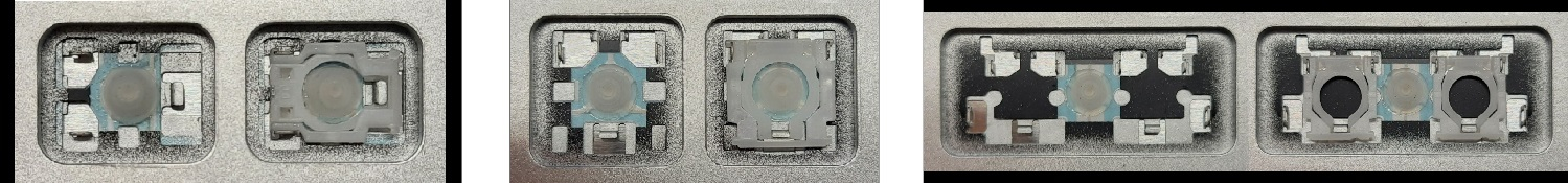 - Bei den meisten Tastaturen, die von außen identisch aussehen, wurden unterschiedliche Arten von Scharnieren unter den Tasten verwendet.