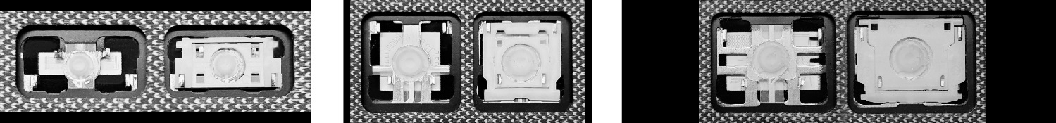 - Bei den meisten Tastaturen, die von außen identisch aussehen, wurden unterschiedliche Arten von Scharnieren unter den Tasten verwendet.