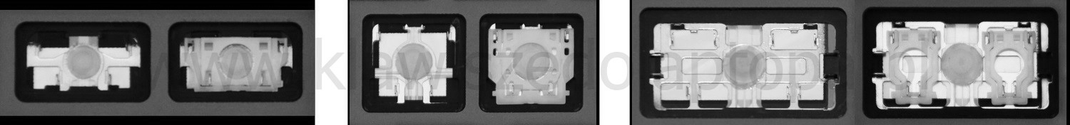 - Bei den meisten Tastaturen, die von außen identisch aussehen, wurden unterschiedliche Arten von Scharnieren unter den Tasten verwendet.
