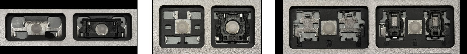 - Bei den meisten Tastaturen, die von außen identisch aussehen, wurden unterschiedliche Arten von Scharnieren unter den Tasten verwendet.